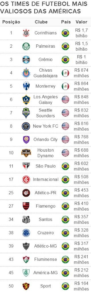 A revista americana “Forbes” divulgou nesta semana um ranking dos clubes mais valiosos das Américas. Três brasileiros ocupam o pódio: Corinthians, em primeiro, Palmeiras, em segundo, e Grêmio, em terceiro. No top-50, também estão São Paulo (11º), Inter (17º), Atlético-PR (25º), Flamengo (27º), Santos (34º), Cruzeiro (38º), Atlético-MG (39º), Fluminense (43º), América-MG (45º) e Sport (50º).